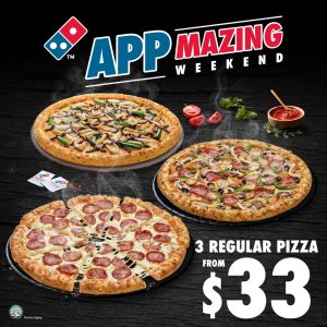 Weekend plans sorted with Domino's! Enjoy 3 Regular Pizzas from just $33 via the Domino's App. Perfect for sharing. Valid 27-28 Dec 2025 only. Order now!