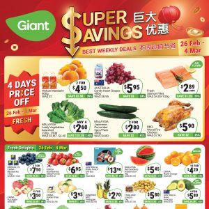 Score massive discounts with Giant Super Savings from 26 Feb to 4 Mar 2026! Enjoy 4 Days Price Off specials, 1-for-1 fresh deals, and huge grocery markdowns.
