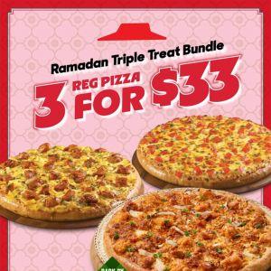 Don't miss the Pizza Hut Ramadan Promotion! Enjoy the Ramadan Triple Treat Bundle with 3 Regular Pizzas from just $33, featuring the Rendang-licious Pizza.