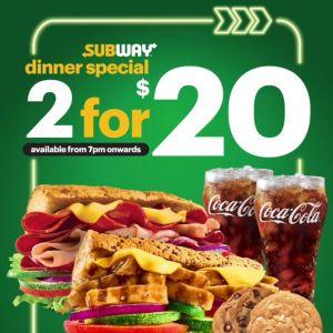 Enjoy Subway’s 2-for-$20 dinner deal in Singapore. Get two 6-inch subs, two drinks and two cookies from 7pm onwards. While stocks last.